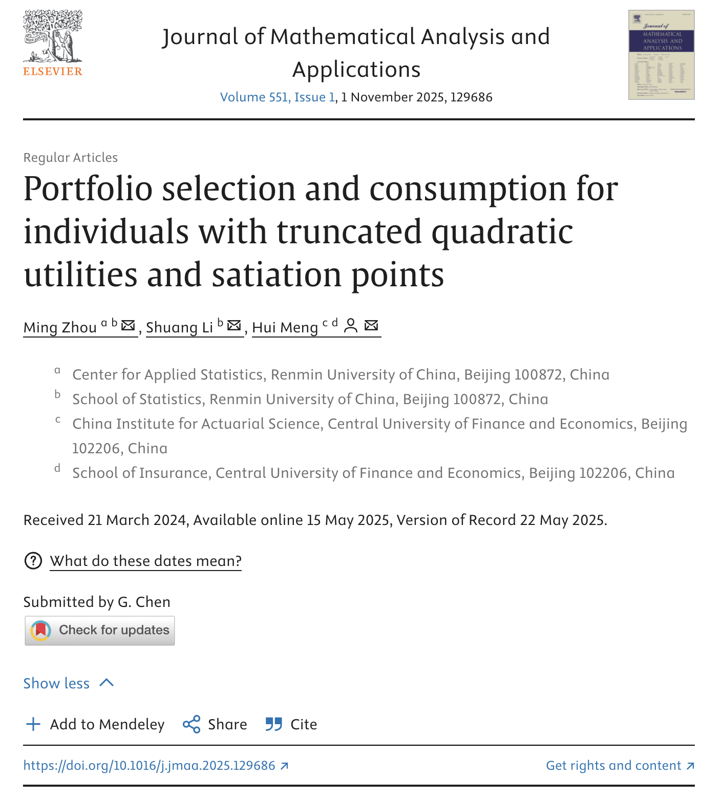 我院孟辉教授近日与中国人民大学周明教授及博士生李爽在我校AA类重要期刊Journal of Mathematical Analysis and Applications发表论文,题目为“Portfolio selection and consumption for individuals with truncated quadratic utilities and satiation points”。