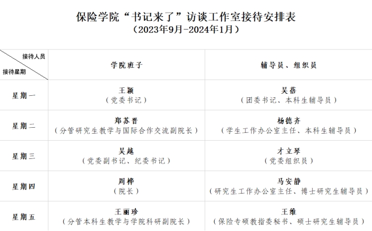 下面是“书记来了”访谈工作室2023-2024学年第一学期的接待安排表,欢迎广大师生共同交流。