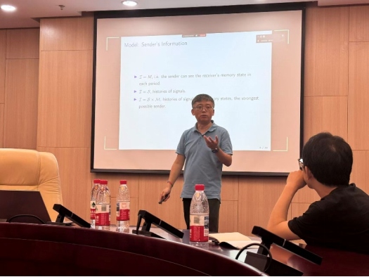 在下午的报告中,刘庆民教授深入探讨了一个动态博弈模型:其中一方为具备完全理性且掌握私人信息的发送者(如专家、媒体或企业),另一方为在有限理性条件下行动、无私人信息的接收者(如决策者、选民或监管机构)。该模型着重分析在认知资源不对称的情形中,信念如何形成、行为模式怎样演化,以及相应的制度设计应如何回应这类信息与理性层次的非对称性。刘教授指出,传统博弈论通常假设参与者具有对称的理性结构与完整的信息处理能力,而在真实场景中——如药企与FDA之间的审批沟通、媒体对选民的观点影响、父母与孩子的教育互动等——一方往往拥有显著的信息或认知优势。通过引入有限自动机(finite automata)建模接收方的有限记忆与更新规则,他系统分析了发送者如何策略性地生成信号以影响接收者的信念与行为,以及接收者又应如何设计学习机制以抵御策略性操纵、提取有效信息。
