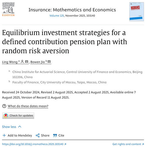 我院王玲老师近日与澳门城市大学贾博文老师在我校AA类重要期刊Insurance: Mathematics and Economics发表论文,题目为“Equilibrium investment strategies for a defined contribution pension plan with random risk aversion”。