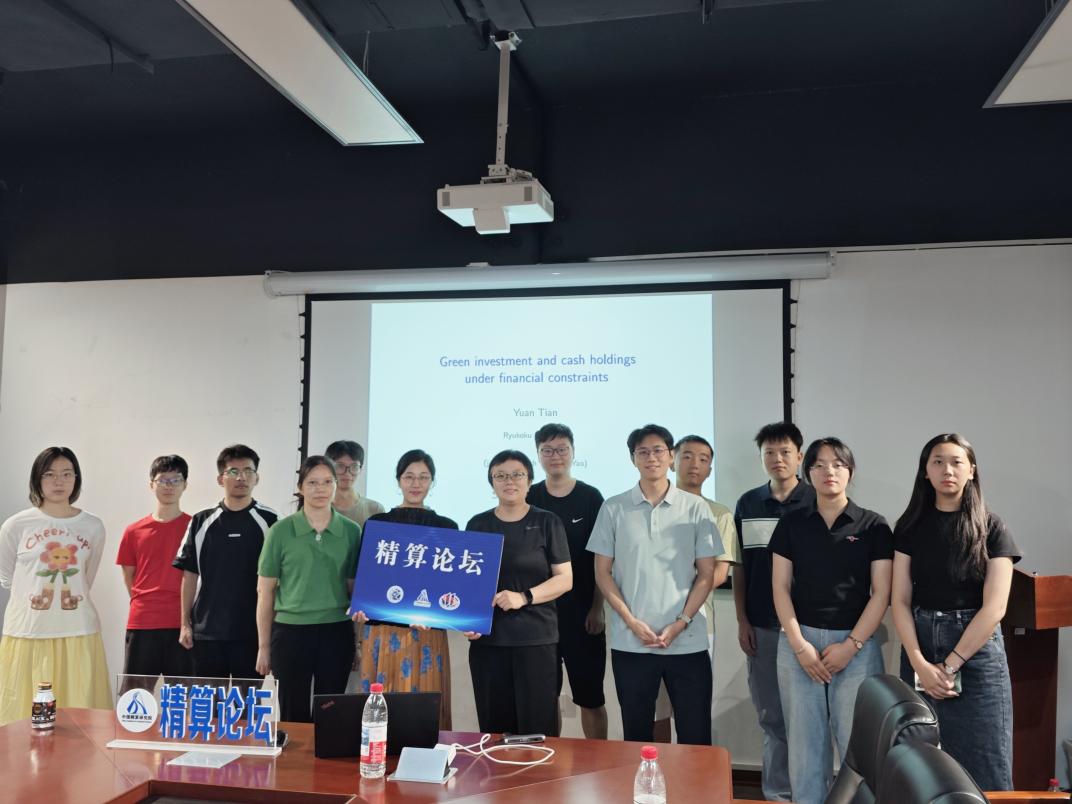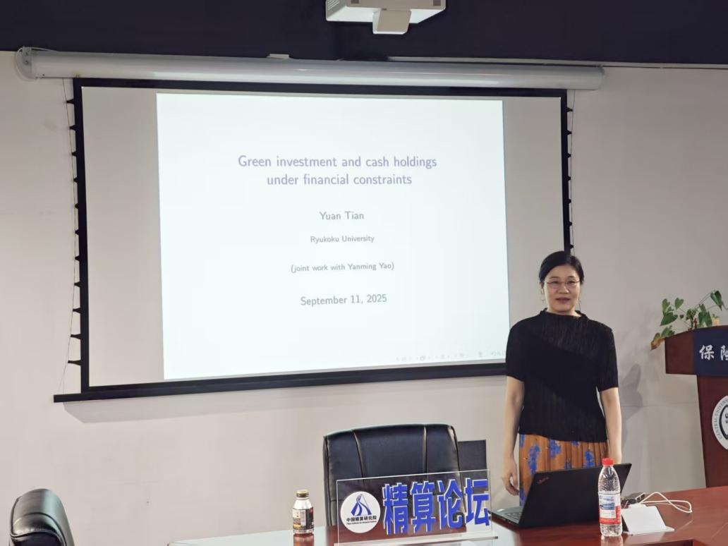 2025年9月11日上午,应ylzzcom永利总站线路检测、中国精算研究院郑敏教授邀请,日本龙谷大学经济系Yuan Tian教授在澳门永利沙河校区13号楼215会议室给我院师生作了主题为《Green Investment and Cash Holdings under FinancialConstraints》的学术报告。论坛由郑敏教授主持,我院伍慧玲教授、博士研究生、硕士研究生积极参与并聆听了报告。